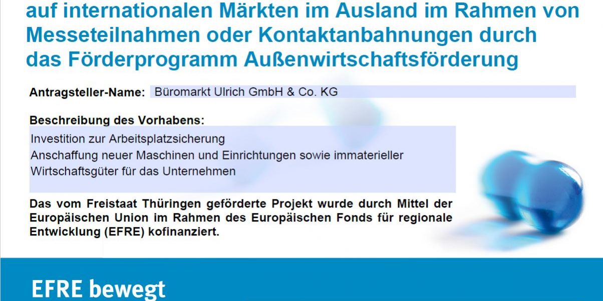 Unser Unternehmen wurde im Juli 2015 durch die Thüringer Aufbaubank gefördert. Mit den Fördermitteln wurden Neuanschaffungen im Soft- und Hardwarebereich durchgeführt. www.aufbaubank.de Autor: WebUlrich KommentarnavigationZurückVorheriger Beitrag:Abverkauf Kalender 2017Related PostsAnpassungen aufgrund der aktuellen COVID-19 Epidemie20. März 2020Neue Öffnungszeiten ab Mai 201825. April 2018Frohe Weihnachten und einen Guten Rutsch in’s Neue Jahr!21. Dezember 2017BROTHER Truck-Tour 201729. August 2017Schulstart 2017/201829. Juli 2017Neue Homepage ab September 201717. März 2017